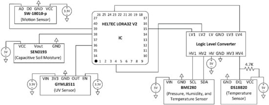 We have implemented five sensor nodes as proof of concept at this stage. The nodes have been installed in an indoor environment to collect different monitoring parameters. Figure 18 shows the schematic diagram of the node circuit, while Figure 19 shows the assembling of the sensor nodes. Figure 20 shows the complete system architecture where the configuration of LoRaWAN server on The Things Network (TTN) stack has been configured to receive monitoring data from LoRa sensor nodes and visualized using ThingSpeak Platform. Figure 21 shows the measurements from sensor node number “Heltec 04” since 19 February 2022. The data are available online using the following links: Heltec 04 (https://thingspeak.com/channels/1657668), Heltec 03 (/channels/1657672), Heltec 02 (/channels/1657658), Heltec 01 (/channels/1657655), and Heltec 00 (/channels/1657654). The stored data on ThingSpeak platform includes air temperature, air humidity, soil temperature, soil humidity, pressure, and UV intensity, as shown in Figure 21.