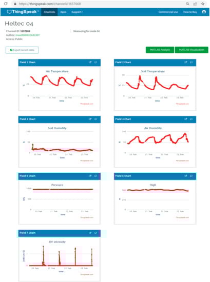 Dashboard for sensor values obtained from sensor node “Heltec 04” during the period from 19–23 February 2022. Data are available online using the following link (https://thingspeak.com/channels/1657668).
