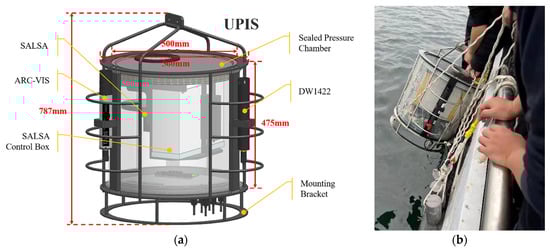 UPIS and in situ experiment. (a) Dimensions and components of the UPIS; (b) UPIS in situ experiment.