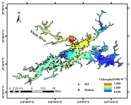 Light field conditions were generally excellent during the experiment, with a small amount of cloud cover. Figure 3 shows the distribution of sites used in this experiment. Considering the convenience and safety of the experimental process, the UPIS experiment was conducted at MT site. Meanwhile, we measured chlorophyll concentration at 21 other sites to obtain the chlorophyll concentration distribution of Qiandao Lake. The sampling results showed that the chlorophyll concentration of the MT site was 1.02 mg m−3 and water depth was 8 m.