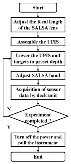 At the beginning of the experiment, the UPIS was assembled on the deck to check the waterproofness of the sealing cabin equipped with the SALSA camera. Then, the UPIS was lowered to the pre-designed water depth and fixed vertically. The lens of the SALSA camera was perpendicular to the water surface, and the field of vision was kept far away from the shadow of the ship as much as possible. Moreover, the target was positioned to the pre-designed depth. By moving the target, the image of interest gradually becomes sharper in the software.