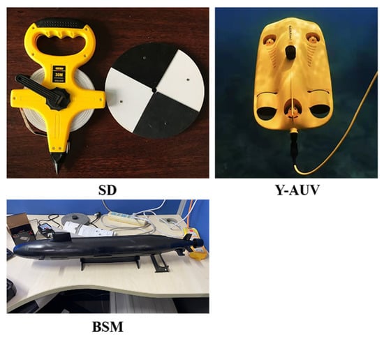 In Experiment 2, underwater imaging of the UPIS was studied using three artificial targets: a Secchi disk (SD), a black ship model (BSM), and a yellow autonomous underwater vehicle (Y-AUV) (see Figure 5). It should be noted that, during the experiment, to clearly image the SD using the UPIS, the black-and-white side was downward, and the non-black-and-white side was upward, so that the SD could be clearly and intuitively identified in the real-time imaging when targets were observed from the bottom up. The reasons for using these objects were as follows: The SD was arranged to reflect the ability of UPIS to distinguish the target with a simple black-and-white segmentation line from bottom up. Compared with the SD, there was not clearly segmentation line on the surface of the Y-AUV, while performed the capacity of Y-AUV to bottom-up polarization image targets with complex contour features. Then, the BSM surface was coated with highly absorption material such as black matte paint, and there were no complex contour features or evident segmentation on the body. In the background of water surface while UPIS imaging from bottom up, identifying the BSM was the most arduous among the three artificial targets.