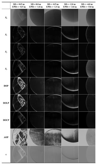 Figure 6 shows the change of each imaging parameter that occurred by changing the depth of the SD and the UPIS. With the deepening of the SD and the UPIS in the water, the intensity of the surrounding light field gradually weakened, resulting in a gradual increase in the difficulty of underwater target detection. At the beginning, the SD was 0.5 m above the water surface, and the UPIS was 0.5 m below the water surface. It can be seen from the S0 image that the light field condition was proper at this time. The total light intensity parameter S0 and polarization parameters S1, S2, S3, DOP, DOLP, DOCP, AOP, and ε; clearly exhibit the edge information of the SD. With the deepening of depth, the light intensity around the SD and the UPIS gradually weakened, and the intensity of the upward radiation in water entering the SALSA lens after being reflected by the surface below the SD further weakened. With increasing depth, it became more and more difficult to identify the black-and-white segmentation line of the SD by just using S0. When the SD was 4.0 m underwater and the UPIS was 5.0 m underwater, it became almost impossible to make out the black-and-white segmentation line of the SD simply through intensity only. Relatively, the performance of polarization parameters for target detection gradually improved with increasing depth, especially the AOP, which can clearly distinguish the black-and-white segmentation line of the SD. Compared with the S0 image, the edge obtained using polarization parameter imaging is clearer; that is, the target recognition capability is stronger.