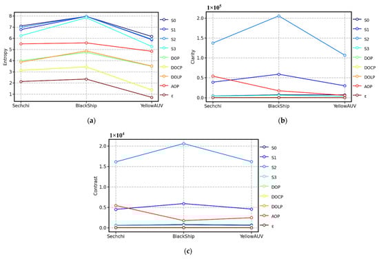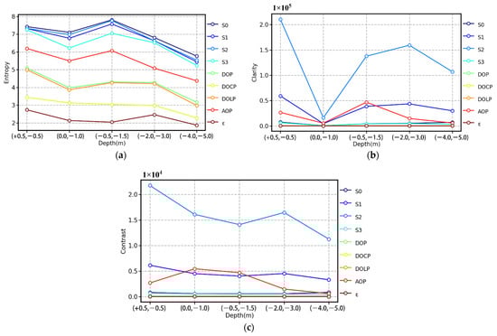 On the basis of Figure 6, we can easily work out that the capability of the AOP in terms of underwater target recognition is prominent at different water depths. Analytically, according to Equations (9)–(11), the entropy, clarity, and contrast all the parameters can be calculated, respectively, as shown in Figure 7. Because S0 is strongly affected by the absorption and scattering of particles in water, the S0 image will contain considerable background noise, which is evident in Figure 7a. Figure 7a shows that the entropy of S0, S1, S2, S3, and AOP is higher, whereas that of other parameters is relatively lower. In Figure 7b,c, the parameters with high clarity and contrast are also S0, S1, S2, S3, and AOP, but the performance of S0 is apparently worse, while the performance of AOP, S1, and S2 is still excellent. These results demonstrate that polarization imaging can indeed improve the ability of underwater target detection. Moreover, in the case of a weak light field, combined with Figure 6, the AOP is more noticeable than S1 and S2 visually.
