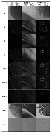 Figure 8 shows S0, S1, S2, S3, DOP, DOLP, DOCP, AOP, and ε; corresponding to the SD, BSM, and Y-AUV when the targets were located on the water surface and the UPIS was located 1 m below the water surface. Generally, other cameras acquire images only through the intensity (S0, the first component of the Stokes vector). In contrast, the UPIS could imagine targets not only by intensity, but also by different polarization parameters. As could be seen from Figure 8, AOP imaging clearly distinguished the black and white lines of SD in field real-time imaging, while other imaging parameters have unsatisfactory ability to distinguish the black and white lines. It can be seen that images of AOP contain abundant details, where the texture and edge of targets under water are clearly highlighted. Compared with the SD, there was not clearly segmentation line on the surface of the Y-AUV, while performed the capacity of Y-AUV to bottom-up polarization image targets with complex contour features. For Y-AUV, the field imaging quality varied greatly with different parameters. AOP could not only distinguish the interface between Y-AUV and water, but also distinguish the color of Y-AUV body from the surrounding. Other parameters were not only inferior to AOP in the boundary differentiation of field real-time imaging, but also the color of Y-AUV body was almost the same as that of surrounding waters. Although the S0 could also distinguish the body and boundaries of Y-AUV, it was not as sharp and contrasting as AOP, as shown in Figure 9. In Figure 8, it was evident that S0 could not recognize waves caused by the agitation of the traction line, while DOCP and ε; could hardly distinguish the boundary between the BSM and the surrounding environment. In Figure 9, the entropy, clarity, and contrast of the imaging showed that AOP performed excellent among all parameters when identifying BSM. This further indicates that, for underwater target imaging observed from bottom up, the imaging quality of the AOP is optimal for these types of targets.