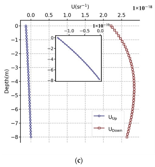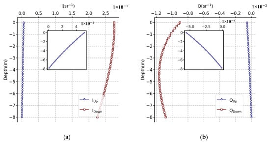 (a) I, (b) Q, and (c) U variation with water depth based on the OSOAA radiative transfer model simulation. The in situ water depth was 8 m. The solar zenith angle and viewing zenith angles were 45° and 0°, respectively. The simulated wavelength was 550 nm. The chlorophyll concentration at the water surface was 1.02 without regard to mineral-like particles and yellow substances and detritus. The aerosol optical thickness was 0.611, and M90 of the Shettle and Fenn model [30] was adopted.