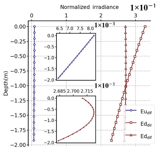 Underwater upward diffuse irradiance (Eudif), downward direct irradiance (Eddir), and downward diffuse irradiance (Eddif) variation with water depth based on the OSOAA radiative transfer model simulation. Only the depth range with the target and the UPIS is shown.