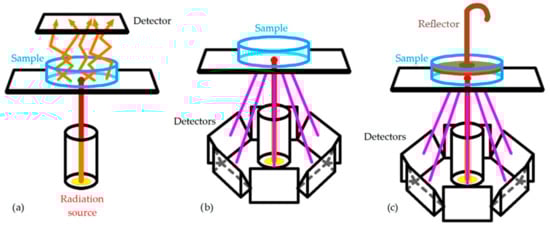 An NIR spectrometer is composed of a radiation source (the most common is a tungsten–filament–fire halogen lamp with quartz window), a wavelength selector (generally a dispersive equipment), a sample holder, and a detector (generally built with semiconductors such as InGaAs and PbS). There are many sample holders depending on how the NIR spectrum is acquired []: transmittance, reflectance, and transflectance (Figure 1).