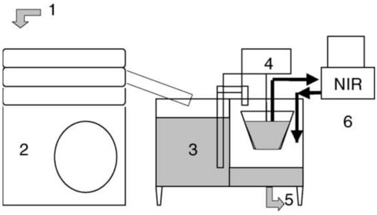 Schematic diagram of the proposed NIRS sensor in the last pass in the olive oil extraction process: (1) oil from horizontal centrifuge decanter; (2) vertical centrifuge for oil clarification; (3) tank for oil sedimentation; (4) continuous oil weigher; (5) to oil storage container; (6) NIRS equipment [].