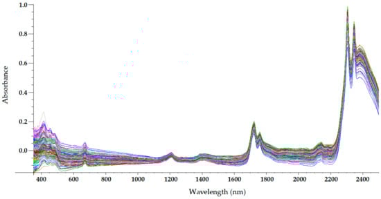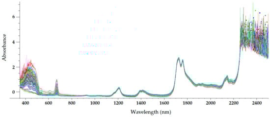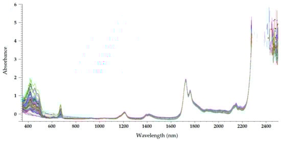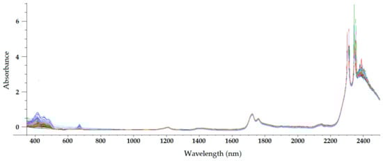 The sample temperature has a great influence on the NIR radiation that it reflects and absorbs, which makes temperature a parameter of paramount importance in NIRS. For olive oils (and other oils), a sample temperature of approximately 32 °C is usually chosen [,,,,,,]. At this temperature, olive oil is a homogeneous liquid, with a non-important loss of volatile compounds occurring. Therefore, the only sample preparation required in NIRS is heating and maintaining olive oil at that temperature during spectrum acquisition. On the other hand, near-infrared radiation penetrates deeper into organic samples than other electromagnetic radiations, such as ultraviolet (UV), visible, far-infrared, and mid-infrared radiations []. Therefore, the optical path length chosen when acquiring NIR spectra has a significant influence on the radiation absorption intensity at different wavelengths. Figure 3, Figure 4, Figure 5 and Figure 6 show the visible-NIR spectra of 127 olive oils from the variety ‘Picual’ acquired using a Labspec Pro 350-2500P visible/NIR spectrophotometer (Analytical Spectral Devices Inc., Boulder, CO, USA) equipped with three detectors and an operating in transmittance mode. This equipment was used for the spectral acquisition of olive oils in the range 350–2500 nm using quartz cuvettes with different path lengths (from 0.5 to 10 mm) as sample holders. The reflectance was transformed into absorbance. As shown in these figures, the use of cuvettes with higher path lengths for spectral acquisition leads to higher absorbance in the NIR region, thus providing smoother NIR spectra that are more suitable for further building mathematical models for the determination of quality parameters []. In this sense, small differences in path length (0.2 and 0.5 mm) when acquiring the spectra of South African EVOO in the transflectance mode with quartz cuvettes as sample holders have been reported not to have a significant effect on regression model performance [].