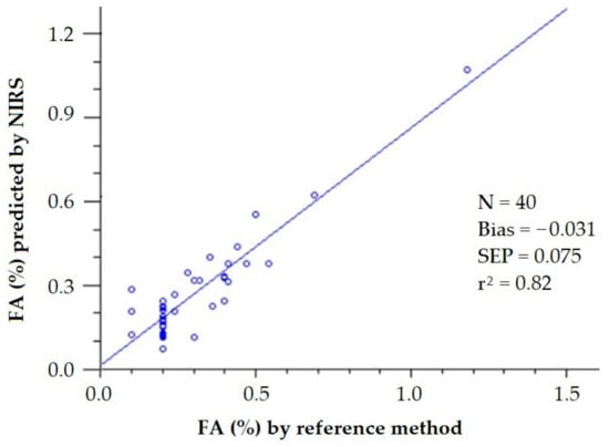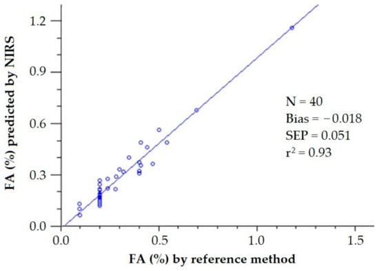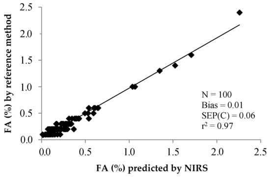 All in all, it can be concluded that the free acidity of olive oils can be measured by NIRS with great precision. This precision can be graphically observed when plotting the predicted values against the FA measured by the reference method (Figure 7).
