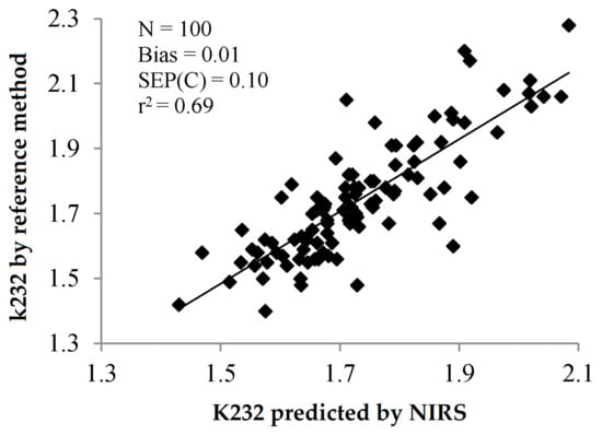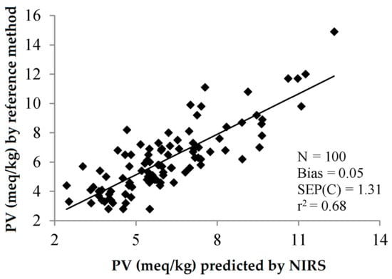 Finally, other parameters of interest for the quality of olive oil, such as the oxidative stability, for which the units are time-based, have been predicted by visible/NIR spectroscopy with relatively good precision [], as illustrated in Table 7.