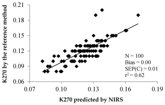Parameters such as total polyphenols have not been successfully predicted by NIRS. In this sense, SEPs of 82.10 and 89.66 mg/kg were obtained when analysing total polyphenols in EVOO using two spectrometers, SEL being 9.24 mg/kg for samples in the range 44.49–738.76 mg/kg []. Other authors achieved a good correlation coefficient of calibration (r2cal = 0.85) and a lower error of prediction (RMSEP = 44.5 mg/kg) [], but these were still a bit high for practical use.