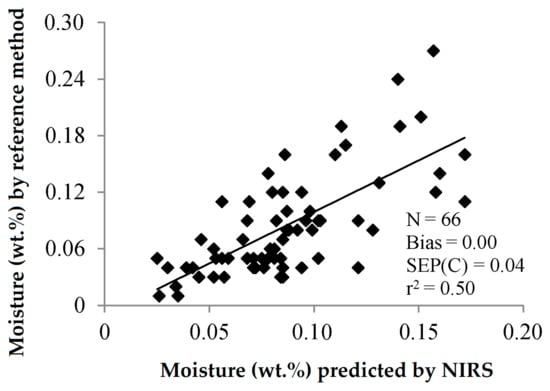 Moisture, which can promote the rancidification of olive oil, leading to an unpleasant taste and an unpleasant odour, has been determined by PLS-NIRS to achieve an r2cal of 0.71 and a bias-corrected SEP of 0.04 wt.% []. Taking into account that the moisture and volatile matter content is another quality criterion of the International Olive Council, and it must be ≤0.2 wt.% for edible olive oils [], this prediction error should be lowered a bit. The relation between analysed and predicted values obtained by these authors is illustrated in Figure 13. It is worth noting that the determination of water content in olive oils by NIRS has not been assayed to date by using only the wavelengths where the broad absorption bands of water are found (at 1400 and 1950 nm).
