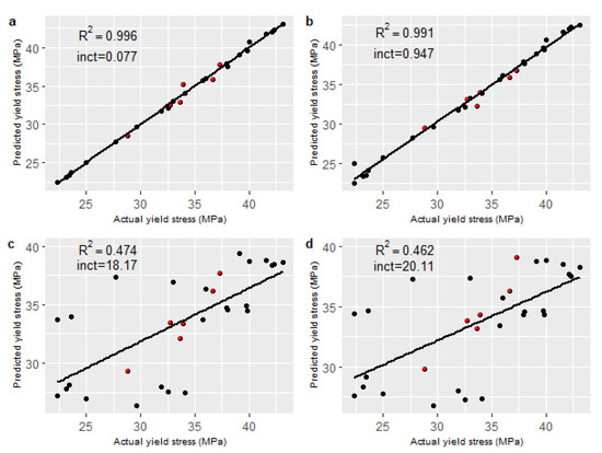 Figure 3. Linearity plots with R2 and intercept values for all unseen data. (a) PCA–RF; (b) PCA–SVR; (c) PLS (n = 4); (d) PCR (n = 5). The black points relate to the internal validation set and the red points relate to the external test set.