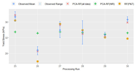 Model accuracy was evaluated based on the mean predicted value of the yield stress for each process run, as given by Equation (6). That is, while a yield stress prediction was made for every observation in the process data (at a frequency of 5–10 Hz), the observed mean yield stress in the product was indicative of the material that had been processed over the entire four-minute run at each process condition. Hence, by averaging the predictions over the equivalent period, a more appropriate rate for predicting mechanical properties was applied. In the equation below, y i ^ is the mean predicted value of the yield stress and y i ¯ is the mean value of the yield stress observed for the corresponding process run, while ( n r ) is the number of process runs.