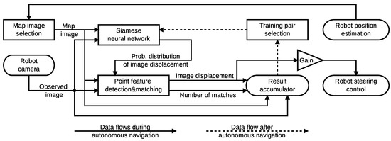 In the second autonomous traversal, which is emulated by re-running the sequence contained in the ‘Fall’ Nordland sequence using the sequence as a map, the feature matcher is already using the output of the neural network trained in the previous step, constructing the training set , which is used to further train the neural network and an image displacement sequence , which can be used to evaluate the quality of navigation. Moreover, the stored data can also be used to construct an additional training set using the sequence as a map and sequence .