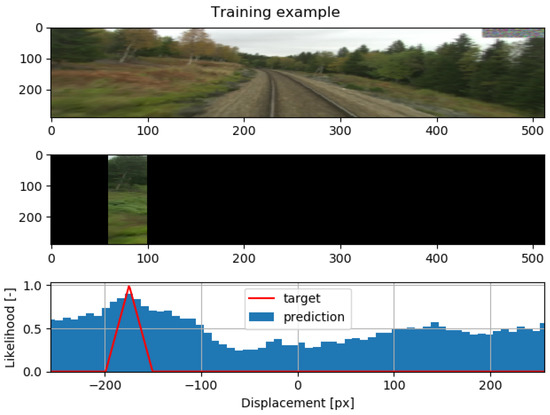 The target for the training pair is constructed to reflect the position of the cutout in the original image and the displacement between the images obtained by the feature matcher. The visualization of one training sample and its target is shown in Figure 3. Similarly to [28], the loss function L is calculated as binary cross-entropy between the prediction and the target as