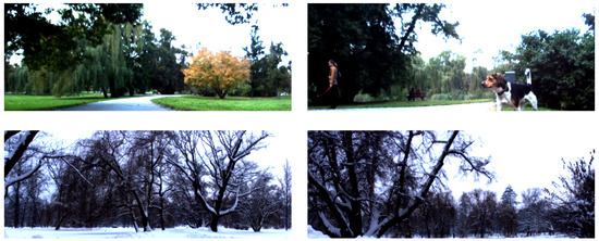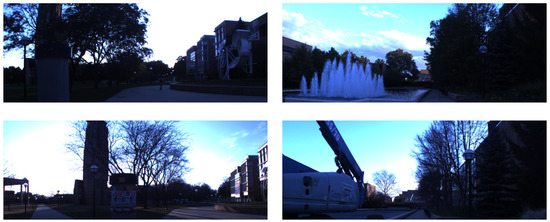 The ‘North Campus Long-Term Dataset’ Was collected on the ground of the Michigan university using a robot-mounted omnidirectional camera, planar and 3D lidars and GPS-RTK for truth [53]. The whole dataset is comprised of 27 recording sessions that span over 15 months, capturing premises of the university campus outdoors and indoors following different paths at varying times and seasons. Two sequences were selected as in [20] spaced half a year apart during February and August of 2012 illustration of the data be seen in Figure 6. These sequences were processed and hand-annotated to obtain a dataset with a similar structure as the Stromovka one. The final dataset has 538,1024 × 384 pixel image pairs captured during two recording sessions.