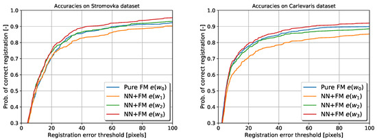 The results are visualised in the same way as in [24,28,47]. Figure 7 displays the results by showing the probability of image registration error , in pixels (px), being lower than a given threshold.