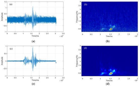 Figure 2. Seismic signals and time-frequency diagrams under different SNR (0 dB and 20 dB). (a,b) are the seismic waveform and time-frequency diagram of SNR = 0 dB; (c,d) are the seismic waveform and time-frequency diagram of SNR = 20 dB.