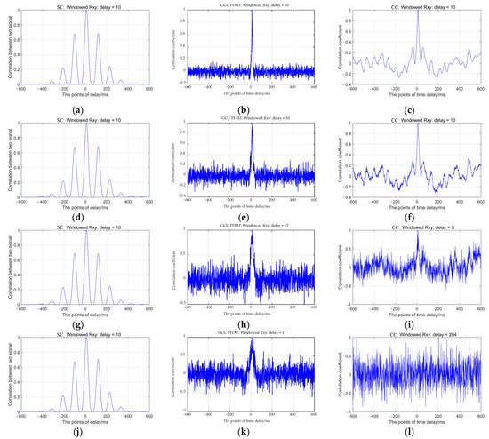 Figure 3. Time delay values calculated by the SC method: (a) SNR = 30 dB, delay = 10 ms, (d) SNR = 20 dB, delay = 10 ms, (g) SNR = 10 dB, delay = 10 ms, (j) SNR = 0 dB, delay = 10 ms; the GCC-PHAT method: (b) SNR = 30 dB, delay = 10 ms, (e) SNR = 20 dB, delay = 10 ms, (h) SNR = 10 dB, delay = 12 ms, (k) SNR = 0 dB, delay = 11 ms; and the CC method: (c) SNR = 30 dB, delay = 10 ms, (f) SNR = 20 dB, delay = 10 ms, (i) SNR = 10 dB, delay = 8 ms, (l) SNR = 0 dB, delay = 204 ms.
