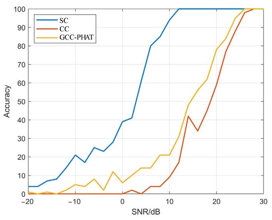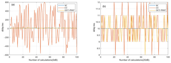 As seen in Figure 4a, when the SNR is 0 dB, the time delay deviation of the CC method reaches ±600 due to the influence of background noise, which has deviated from the true value. The time delay values of the GCC-PHAT method and the SC method are small, but there is still some deviation. As can be seen from Figure 4b, when the SNR is 20 dB, the time delay calculated by the SC method has no deviation, while the time delay value deviation of the CC method is ±2 and the GCC-PHAT method delay value is ±1. In contrast, the performance of the SC method is better and the CC method has lost its effect when the SNR is low.