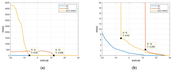 Figure 6. The precision of the three methods when the SNR is -20~30. (a) the RMSE of the TDE with different SNR; (b) the enlarged view of (a) with RMSE of 0–20.