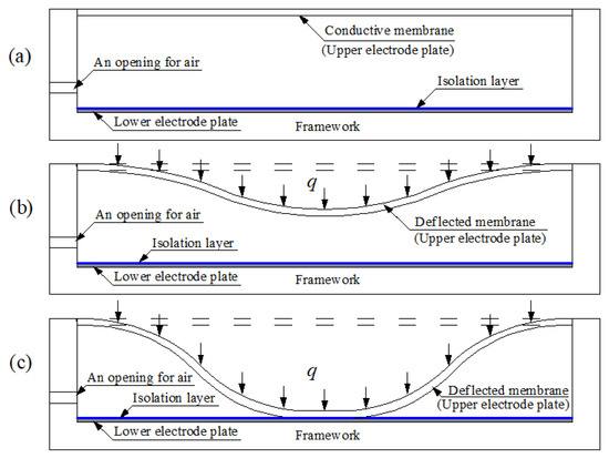 Figure 1 illustrates the typical structure and modes of operation of a traditional capacitive pressure sensor. On application of a pressure q, the conductive membrane, as the upper electrode plate of the capacitor, elastically deflects in response to the applied pressure q. This elastic deflection is a measure of the applied pressure q and also changes the capacitance of the capacitor. Therefore, the applied pressure q can be determined by measuring the change in capacitance. In the so-called normal mode of operation, the deflected conductive membrane, as the upper electrode plate of the capacitor, is always kept at a distance away from the isolation layer coating the lower electrode plate, as shown in Figure 1b, and thus a device operating in this state may also be called a non-touch-mode capacitive pressure sensor. When in the so-called touch mode of operation, the deflected conductive membrane is always kept in contact with the isolation layer, as shown in Figure 1c, and therefore a device operating in this state is called a touch-mode capacitive pressure sensor. Usually, the output capacitance of a non-touch-mode capacitive pressure sensor is nonlinear with respect to the input pressure changes, and the sensitivity in the near-linear region is not high enough to ignore the many stray capacitance effects. Touch-mode capacitive pressure sensors are known to have robust structures to withstand harsh industrial environments and higher sensitivity by one or two orders of magnitude than in the normal mode of operation in the near-linear operation range, so that some of the stray capacitance effects can be neglected. Moreover, the output capacitance of touch-mode devices is mainly the isolation-gap capacitance of the touched area due to the very thin isolation layer, and its capacitance per unit area is much larger than the air-gap capacitance in the untouched area. This is the main reason why touch-mode capacitive pressure sensors are often called linear sensors: the change in the touched area is usually designed to be almost proportional to the applied pressure q, and thus the output capacitance–input pressure characteristic is nearly linear.