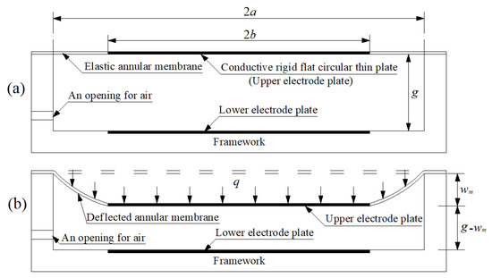 The structure or geometry of the proposed elastic-deflection-and-parallel-plate-capacitor-based pressure sensor is shown in Figure 2a, where a denotes the outer radius of the initially flat non-conductive elastic annular membrane, b denotes the inner radius of the annular membrane, as well as the outer radius of the conductive, rigid, flat, concentric-circular thin plate, and g denotes the initial gap between the initially flat non-conductive elastic annular membrane and the flat lower electrode plate. The inner edge of the initially flat non-conductive elastic annular membrane is rigidly connected to the outer edge of the conductive, rigid, flat, concentric-circular thin plate, forming the topside structure of the proposed pressure sensor. The conductive, rigid, flat, concentric-circular thin plate, as a movable upper electrode plate, forms a parallel plate capacitor with the flat lower electrode plate. On application of the pressure q, as shown in Figure 2b, the initially flat non-conductive elastic annular membrane will deflect towards the lower electrode plate and work as an elastic deformation element in response to the applied pressure q, resulting in the upper electrode plate moving a distance wm (the maximum elastic deflection) from its initial position (that of the initially flat annular membrane) towards the lower electrode plate. Clearly, the movement of the upper electrode plate will result in a capacitance change in the parallel plate capacitor. Therefore, the applied pressure q can be determined by measuring the capacitance change caused in the parallel plate capacitor.