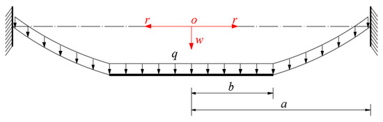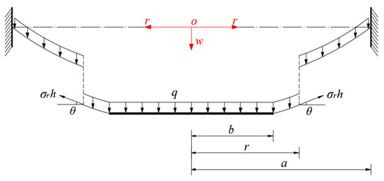 An initially flat, linearly elastic annular membrane with thickness h, outer radius a, inner radius b, Poisson’s ratio v, and Young’s modulus of elasticity E is tightly fixed at its outer edge and connected at its inner edge to a movable, weightless, rigid, concentric-circular thin plate of radius b, resulting in an immovable and non-deformable outer edge and a movable but non-deformable inner edge. At the same time, a uniformly distributed transverse load q is quasi-statically applied to the annular membrane and movable, weightless, rigid, concentric-circular thin plate, resulting in an out-of-plane displacement (deflection) of the annular membrane, as shown in Figure 3. In the figure, a cylindrical coordinate system (r, φ, w) is introduced, with the polar coordinate plane (r, φ) located in the plane in which the geometric middle plane of the initially flat annular membrane is located, and where o denotes the origin of the introduced cylindrical coordinate system (r, φ, w) (which is placed in the centroid of the geometric middle plane), r denotes the radial coordinate, φ denotes the angle coordinate (not represented in Figure 3), and w denotes the axial coordinate as well as the transverse displacement of the deflected membrane. A free body, a piece of annular membrane with radius r (b ≤ r ≤ a), is taken from the central portion of the deflected annular membrane, to study the static problem of equilibrium of this free body under the joint action of the external active force πr2q produced by the uniformly distributed transverse loads q and the reactive force 2πrσrh produced by the membrane force σrh acting on the boundary r, as shown in Figure 4, where σr denotes the radial stress and θ denotes the rotation angle of the deflected annular membrane.