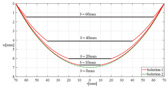 Clearly, under the same transverse loads q, an annular membrane with outer radius a and inner radius b should have the same deflection curve as a circular membrane with radius a when b→0. Therefore, the validity of the closed-form solution given in Section 2 can be proved by examining whether the deflection curves of the annular membrane with outer radius a and inner radius b can gradually approach the deflection curve of the circular membrane with radius a, as the inner radius b gradually approaches zero. To this end, a numerical example is presented, where a circular membrane with Young’s modulus of elasticity E = 7.84 MPa, Poisson’s ratio v = 0.47, thickness h = 0.2 mm, and radius a = 70 mm, and four annular membranes with Young’s modulus of elasticity E = 7.84 MPa, Poisson’s ratio v = 0.47, thickness h = 0.2 mm, outer radius a = 70 mm, and inner radii b = 60 mm, 40 mm, 20 mm, and 10 mm are subjected to the same transverse loads q = 0.0001 MPa. The deflections of the annular membranes are calculated by using the closed-form solution obtained in Section 2, while the deflection of the circular membrane is calculated by using the closed-form solution presented in [24], which is also obtained using “sinθ = 1/(1 + 1/tan2θ)1/2” rather than “sinθ = tanθ”. The results of the deflection calculation are shown in Figure 5, where “Solution 1” refers to the closed-form solution given in Section 2, and “Solution 2” refers to the closed-form solution presented in [28]. It may be seen from Figure 5 that the deflection curves of the annular membranes gradually approach the deflection curve of the circular membrane as the inner radius b decreases gradually from 60 mm to 10 mm, which to some extent shows that the closed-form solution given in Section 2 is correctly derived and basically reliable.