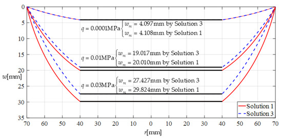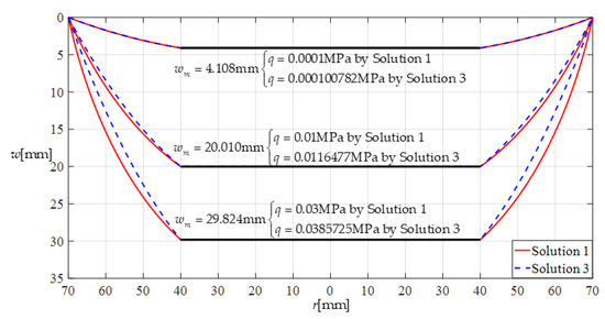Figure 6 shows the differences between the deflection curves calculated under the same loads q by the closed-form solutions before and after improvement, where the annular membrane used has Young’s modulus of elasticity E = 7.84 MPa, Poisson’s ratio v = 0.47, thickness h = 0.2 mm, outer radius a = 70 mm, and inner radius b = 40 mm. “Solution 1” refers to the closed-form solution after improvement (given in this paper), and “Solution 3” refers to the closed-form solution before improvement (presented in [24]). In Figure 6, the maximum deflection values for q = 0.0001 MPa are about 4.108 mm (calculated in Solution 1) and 4.097 mm (calculated in Solution 3), the maximum deflection values for q = 0.01 MPa are about 20.010 mm (Solution 1) and 19.017 mm (Solution 3), and the maximum deflection values for q = 0.03 MPa are about 29.824 mm (Solution 1) and 27.427 mm (Solution 3). From Figure 6 it may be seen that the solutions before and after improvement agree quite closely for the lightly loaded case and diverge slowly as the loads q increase. This is because the rotation angle θ of the annular membrane increases gradually as the loads q increase, and therefore, the error in the deflection calculation introduced by the closed-form solution before improvement (obtained using “sinθ = tanθ” rather than “sinθ = 1/(1 + 1/tan2θ)1/2”) increases gradually as the rotation angle θ increases. This means that it is necessary to use “sinθ = 1/(1 + 1/tan2θ)1/2” (rather than “sinθ = tanθ”) in the derivation of the closed-form solution.