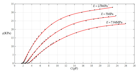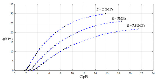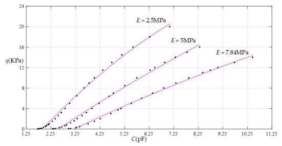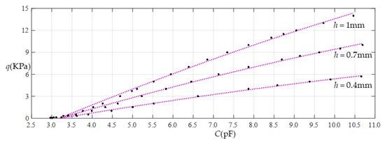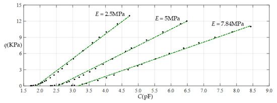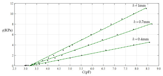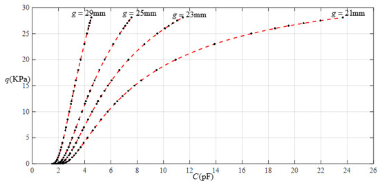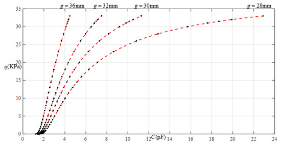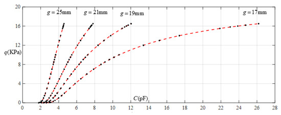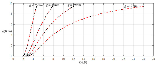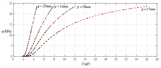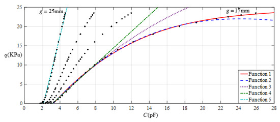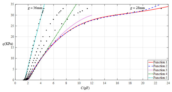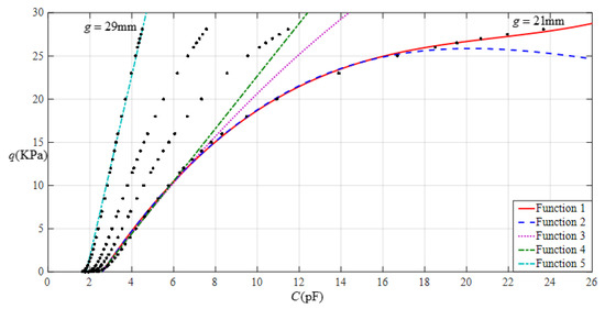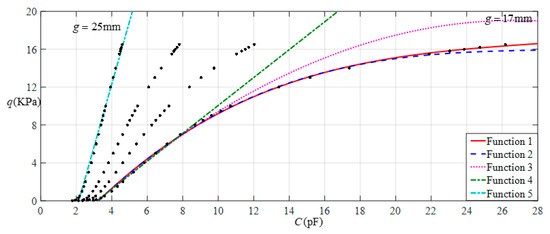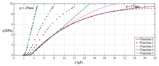 It is often desirable that a sensor is designed with a linear input–output relationship. From Figure 8 it can be seen that the analytical relationship between output pressure q and input capacitance C can be made more linear by increasing the initial air gap g. This, however, will narrow the range of capacitance variation and eventually increase the output pressure per unit capacitance, in addition to increasing the edge effect in the capacitance of the parallel plate capacitor. Therefore, it is best not to do so unless it is necessary. Figure 9 shows the effect of least-squares data fitting for processing the data in Table 1, where Function 1 is a quartic function, Function 2 is a cubic function, Function 3 is a quadratic function, Function 4 is a straight line, and Function 5 is also a straight line. Functions 1−4 correspond to g = 17 mm, and Function 5 corresponds to g = 25 mm. The change in the ranges of the input capacitance C and the output pressure q and the expressions for Functions 1−5 are listed in Table 2. It can be seen from Figure 9 or Table 2 that if the ranges of input capacitance and output pressure are expected to be as large as possible and the output pressure per unit capacitance as small as possible, then the sensor must be a nonlinear sensor, that is, it must be calibrated with Function 3 or Function 2, or especially Function 1 (see Figure 9). It can be found from Table 2 that the output pressure per unit capacitance is about 2.003 KPa/pF and 8.863 KPa/pF corresponding to the two straight-line functions Function 4 and Function 5, respectively. Therefore, if an output pressure of 0.06~11 KPa can meet the design requirements, it is obvious that Function 4 should be used for linear calibration, rather than Function 5.