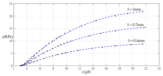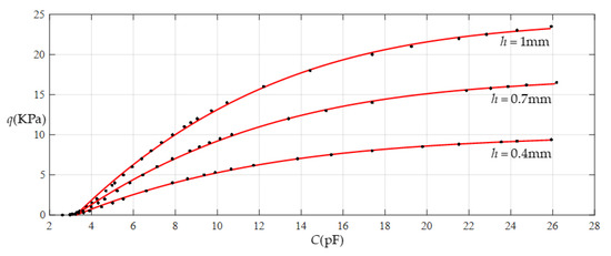 The ranges of pressure q and capacitance C and the expressions for the fitting functions in Figure 11.