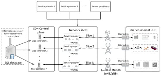 Multi-slice represents the E2E concept implemented in all network segments (RAN, Edge, Core, and transport) [26]. The SDN functionality of the 5G/6G network is available from the edge network to the 6G modem on the customer side. This infrastructure concept allows for fully open access to the service market, which benefits both clients and service providers (Figure 2).