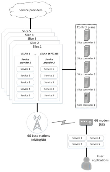 We can expect different providers to offer the same groups of services in the market. Our concept supports the possibility of providing a group of services from different providers within a single slice. We isolate services and service providers by leveraging existing network segmentation mechanisms (e.g., VLAN, VXLAN). This solution allows for a high level of scalability since the number of slices is not limited. We propose using VXLANs to technically separate providers that offer the same services group (within each slice, there can be 224 different providers appertaining to a single service group). This approach enables users to access different slices and choose technical and cost-effective offers, which significantly benefits users. Users have the opportunity to choose a service provider for each service group.