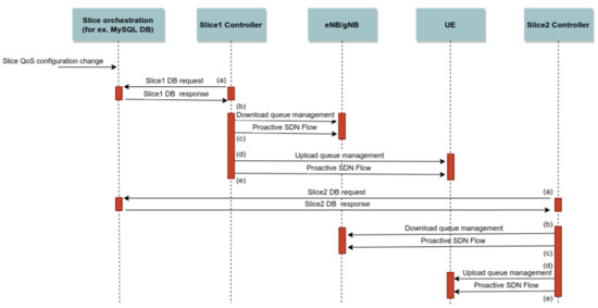 The process depicted in Figure 3 begins with a request for a change of QoS policy for a specific service group in the slice orchestration database. This process contains five steps that each slice controller runs independently from other controllers: