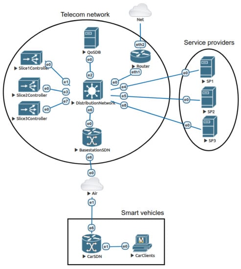 For each slice, we implement two components on the smart vehicle’s side. The first is the CarSDN component (an SDN switch, an integrated part of a 5G/6G modem) that provides user-side programmability, multi-slicing segmentation, and intelligent queue and traffic management. Applying the dynamic creation of queues and the ability to change their parameters enables the automated management of QoS mechanisms. Multi-slice segmentation is provided up to the CarSDN component (5G/6G modem). The example of practical use is presented in Appendix A, Figure A1. One of the roles of this component is to optimally manage the QoS of outgoing communications and to allow dynamic allocation of available upstream bandwidth. The client applications are the second component. They are embedded into the car’s ECUs (Electronic Control Unit) or user’s terminal equipment within the car.