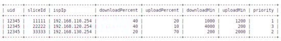 The implementation of the proposed methodology has started by analyzing QoS policies in an SQL database, which we use as a source of information required for dynamically configuring the QoS. Each entry in the database represents a group of services provided by a single slice and contains the following attributes (Figure 5):