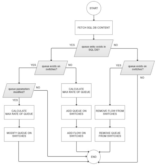 We enable the dynamic control of link bandwidth by following the SDN paradigm through a combination of functionalities contained in the OpenFlow (queue flow assignment) and OVSDB protocols. For QoS to be bi-directionally regulated, queues should be set up on both SDN switches at the base station side (for downstream) and the user side (for upstream). Our proposal for dynamic QoS management is shown in the flow diagram in Figure 3.