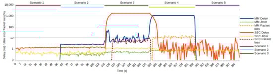 As we can observe, Figure 10 clearly shows that the limitation of the SEC service group upload in Scenario 3 introduces significant delay and packet drops. The service group requires up to 3.2 Mbps (Table 1), but the QoS policy allocates 2.5 Mbps. Therefore, when the queues are filled, all future packages from this service group are dropped. A similar case is with the MM service, where traffic is generated with exponential distribution up to 6.2 Mbps, but the download link is only 6 Mbps.
