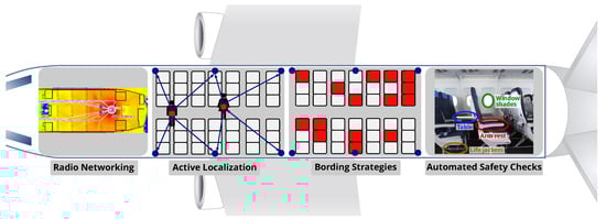 Given these capabilities, the application of integrated WSNs within the connected aircraft cabin provides considerable operational potentials, such as dynamic control of passenger boarding or disembarkation sequences under pandemic requirements [,]. Figure 1 presents application areas outlining the joint use of communication, localization and sensing for aircraft operations. In this paper, we address two of these potentials using radio sensing: seat occupancy detection and the automation of passenger safety checks/announcements.