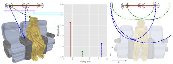 This key idea within the context of the discussed application is briefly given in Figure 2. Here, radio modules are located above each individual seat, possibly serving a dedicated high-speed data link. Assuming a symmetrical constellation, the measured direct path distance from the central device to both outer devices is represented in red. Naturally, the shortest received signal path in the CIR represents the direct path. In addition, reflections caused by the interior (blue) or passengers (green) are also measured. As metallic or plastic materials provide better reflection properties, reflections caused by those objects might have a longer reflection path but are received with less attenuation when compared to a human body reflection. These reflections are mapped to the profile of the scene and geometrically represent individual ellipses.