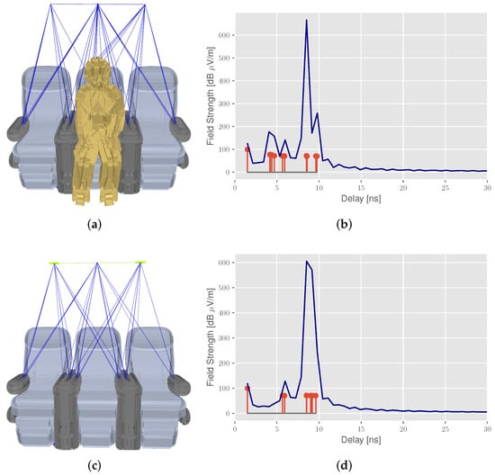 Radio propagation simulation with deterministic ray tracing to explore the multipath propagation of signals in the aircraft cabin: (a) seat 2 occupied with (b) corresponding CIR, (c) reference measurement (no seat occupied) with (d) corresponding CIR. The CIR plots show the propagation paths or multipath components (red) and the bandlimited reconstructed CIR (blue line).
