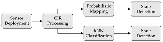 In order to assess the surveyed CIRs as an input for radio sensing state detection, additional deployment, processing and computation steps are required, which are briefly introduced in this section and discussed later on. Given a set of sophisticated radio transceivers, which are presented in Section 4.1, the raw CIR measurements are the essential input for the discussed MARS method (Figure 4).