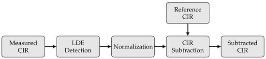 First, the time index of the CIR is aligned at the direct LOS path (Equation (2)) between the transmitter and receiver. For this task, a leading edge (LDE) detection using a dynamic threshold value is applied [,] with the aim of synchronizing the CIR at the direct path. In a second step, the CIR magnitude values are normalized to ensure a better comparability between the different CIR measurements. The normalization of the CIR data is done via the min–max method []: