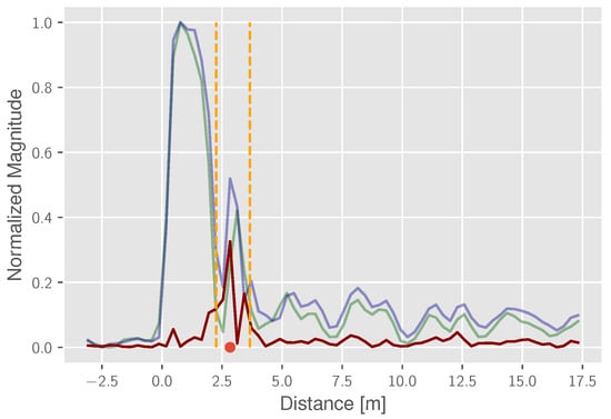 Due to the complexity and spatial ambiguity of reflection sources in real-world scenarios, radio sensing would normally either require more bandwidth or higher infrastructure expenses. However, applying the subtraction computation, changes within the scene are easier to detect. An example for this is given in Figure 6, which was obtained from the conducted measurement campaign. It provides the comparison between the (green) and an exemplary scenario with a detectable target object (blue). The reference reflection path length at the target object is also highlighted (red dot) and is calculated by the given arrangement of the sensors using a maximum estimator. Based on this reference, a time interval (orange) is indicated, where the location and the width of the interval is dependent on the constellation as well as the size and shape of the reflecting object. Finally, the resulting, subtracted CIR is given in red.