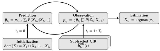 Therefore, we suggest applying a non-parametric, grid-based state estimation approach. In unison with the well-studied Extended Kalman Filter (EKF) and the Particle Filter (PF) [], this multidimensional Histogram Filter (HF) follows the structure of the Recursive Bayes’ Filter (RBF), using a sorted sample state space representation []. This approach is also known as Markov Localization []. It follows a recursive structure consisting of a prediction and correction step based on the Markov assumption (Figure 7), incrementally estimating the hidden state space vector , which represents the two-dimensional position of the reflecting object at timestep , based on the last given state .
