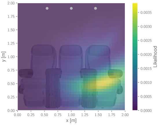 Similar to the previously discussed heatmap of the environment [], this grid mapping allows us to spatially represent reflection areas and therefore indicates the location of reflecting objects. However, unlike the heatmap method, it does not require any assumptions on the underlying probability density function [] and therefore provides a more sophisticated state estimation in the presence of multi-modalities. Figure 8 depicts an exemplary output of the mapping approach given the previously introduced cabin example.